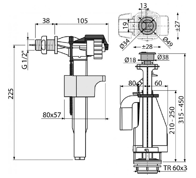 Арматура бачка унитаза боковой подвод двойная кнопка Alcaplast SA08AK 1/2"