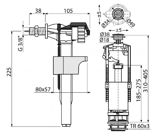 Арматура бачка унитаза боковой подвод стоп кнопка Alcaplast SA2000 3/8"