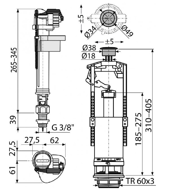 Арматура бачка унитаза нижний подвод стоп кнопка Alcaplast SA2000SK 3/8"