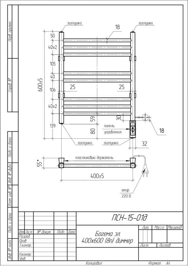 Полотенцесушитель электрический Тера 400x600 Богема с терморегулятором ПСН-15-01д