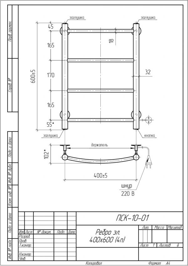 Полотенцесушитель электрический Тера 400x600 Ребро ПСК-10-01