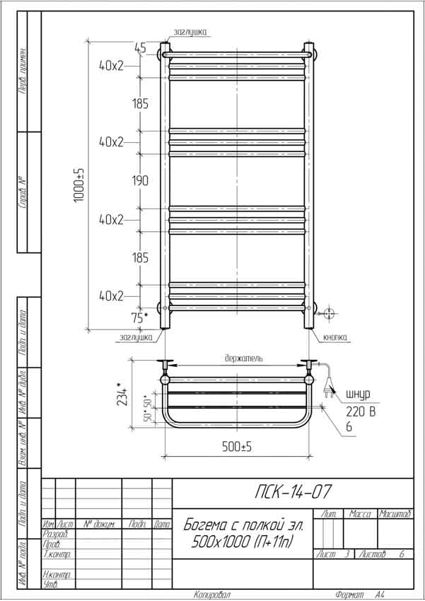 Полотенцесушитель электрический Тера 500x1000 Богема с полкой ПСК-14-07