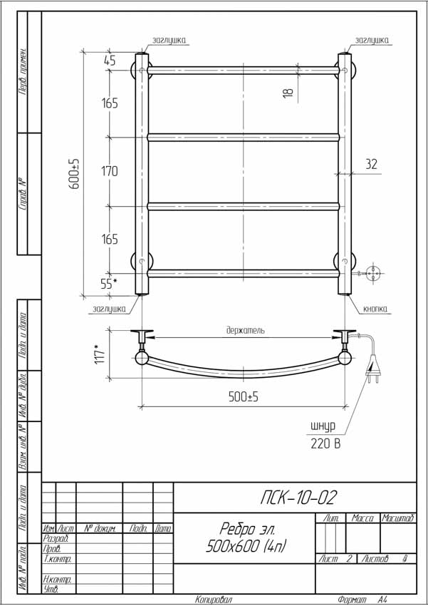 Полотенцесушитель электрический Тера 500x600 Ребро ПСК-10-02