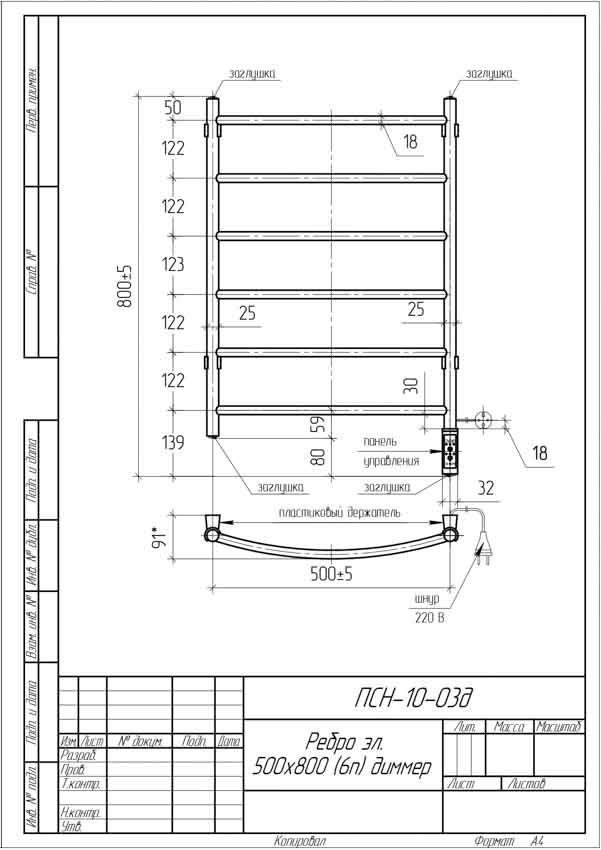 Полотенцесушитель электрический Тера 500x800 Ребро с терморегулятором ПСН-10-03д