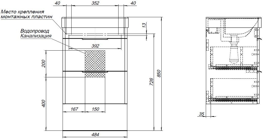 Тумба с раковиной Aquanet Ирис new 50 (Ирис Т) подвесная 2 ящ. цв. белый глянец